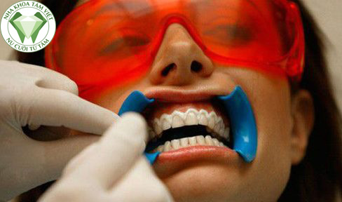 - Tại phòng khám: Dùng ánh sáng chiếu vào răng đã được đặt thuốc tẩy trắng để kích hoạt thuốc tẩy trắng.